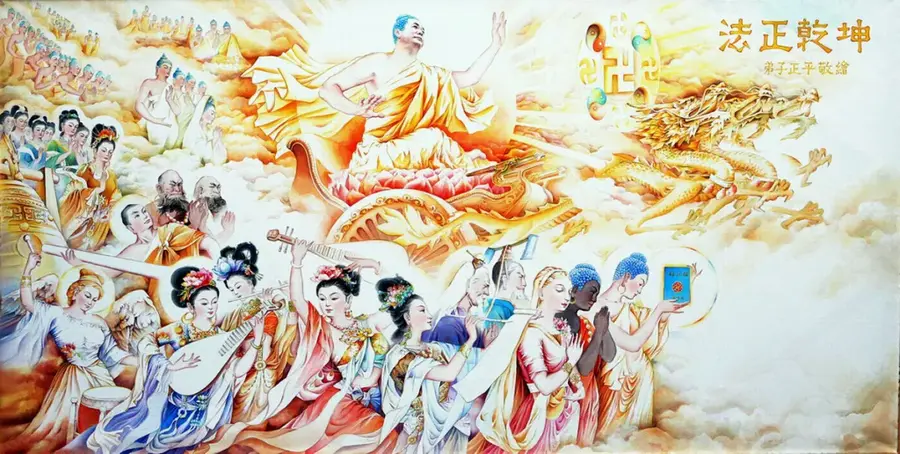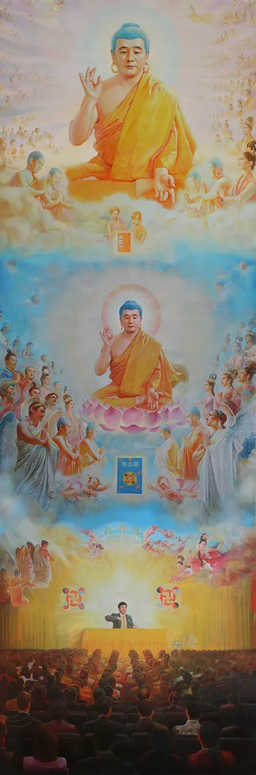 Седнал в драконова колесница, Буда жестикулира с мудра, докато води множество небесни същества на великата мисия за коригиране на космоса. Фалун се издига пред Буда и е изобразен на синята книга, носена тържествено долу вдясно. Мултиетническият микс от божествени фигури отразява приобщаващата природа на Фалун Дафа.