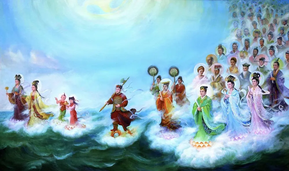 Множество божествени същества слизат от небето в човешкия свят, за да изпълнят обетите си. Фалун (Колелото на закона) е високо, а героите изглеждат достойни, миролюбиви и носещи надежда.