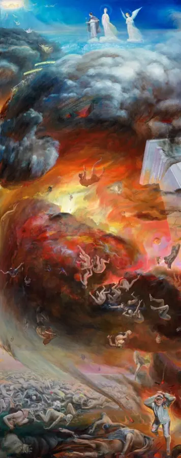 Печеленето на пари от робски труд и отнемането на органи на практикуващите Фалун Дафа доведе човечеството до ново дъно. Лъжите и пропагандата породиха неразбиране и омраза срещу Фалун Дафа. Поради страх от последици или заради финансови стимули, световните правителства, бизнес общността и международните медии не смеят да говорят за тази човешка катастрофа. На думи такива организации държат на съвестта, свободата на вярата и човешките права. Обаче тишината е оглушителна пред лицето на тези престъпления срещу човечеството. Така че зависи от самите практикуващи Фалун Дафа, стоящи в центъра на това преследване, да повишат осведомеността и да разкрият истината. Те непрекъснато казват истината, за да предоставят възможност на хората по света да заемат своето място и да се позиционират. Композицията на картината във формата на S свързва двете крайности – добрите хора, които се възнасят на небето, и нечестивите, изправени пред унищожение. Това е решение, което хората следва да вземат сами.